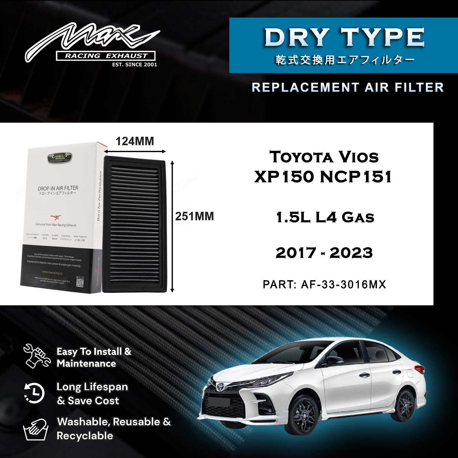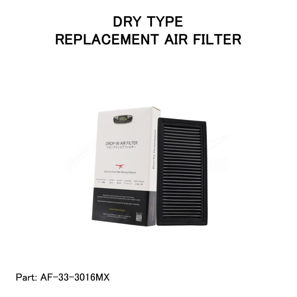 Max Racing Exhaust drop-in air filter is washable, reusable and feature a state-of-the-art design of layered, dry engineered to improve airflow and capture contaminants, and are designed to provide an increase in horsepower. Each performance air filter is reusable, engineered to last for the entire lifespan of your vehicle, and backed by Max Racing Exhaust manufacturer warranty. Max Racing Exhaust drop-in replacement filters are designed to install easily into your factory air box. Upgrade today and start enjoying the horsepower gain and superior performance from Max Racing Exhaust!